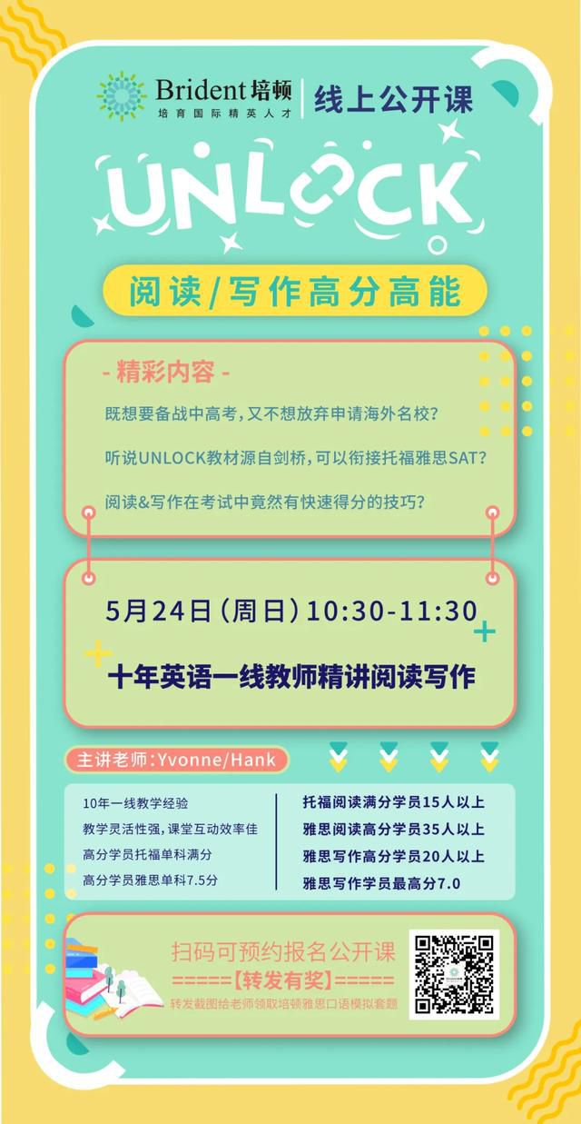培頓的UNLOCK課程教師擁有十年一線英語教學(xué)經(jīng)驗,在閱讀寫作方面有豐富的教學(xué)經(jīng)驗和強大的教學(xué)實力,從英語基礎(chǔ)出發(fā)夯實你的閱讀寫作基礎(chǔ),從中高考試題的考點出發(fā)提升你的考試成績,從托福雅思SAT的教學(xué)視角出發(fā),幫助你順利通過留學(xué)語言考試。