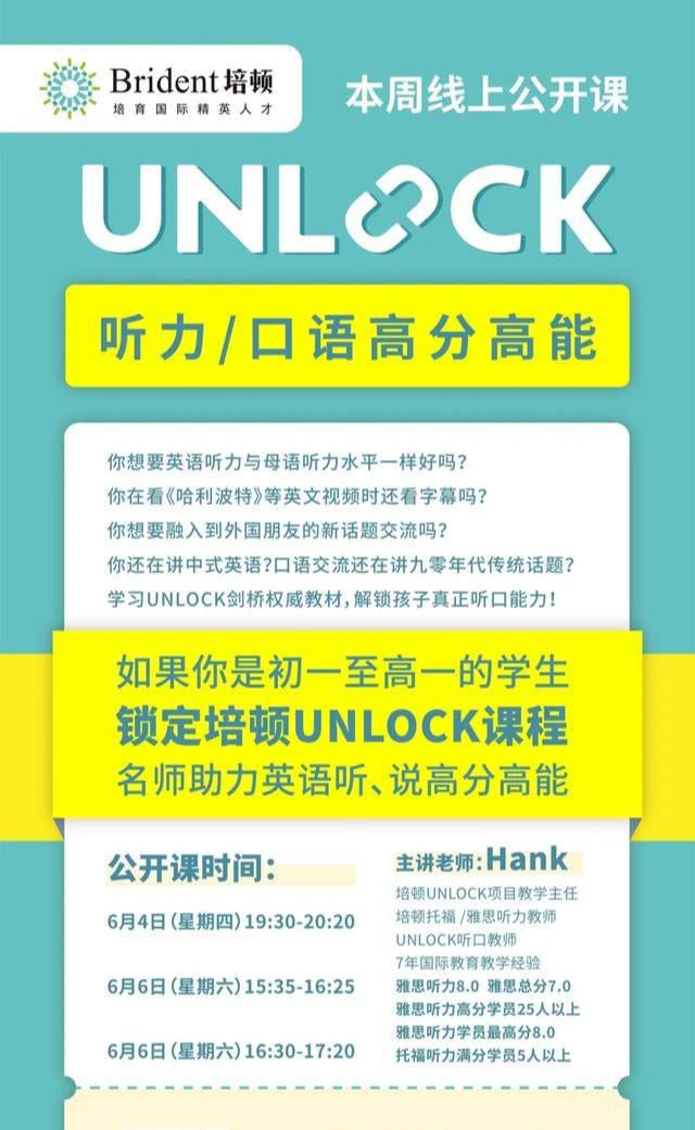 為了同學們有足夠的時間充實英語知識、消化英語要點,我們為你準備了3節聽口公開課、3節閱寫公開課,想要提升英語成績嗎?UNLOCK課程全解決!掃描海報二維碼報名哦~
