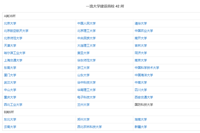 2017年9月21日,教育部、財政部、國家發展和改革委員會聯合發布《關于公布世界一流大學和一流學科建設高校及建設學科名單的通知》,正式公布世界一流大學和一流學科建設高校及建設學科名單,首批雙一流建設高校共計137所,其中世界一流大學建設高校42所(A類36所,B類6所),世界一流學科建設高校95所;雙一流建設學科共計465個(其中自定學科44個)。