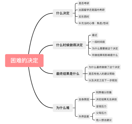 首先要清楚地表達需要做什么決定,在回答完問題之后適當補充當時的當時的心情如何,是非常焦急、焦慮還是比較悠閑、有很多時間去思考再做決定。