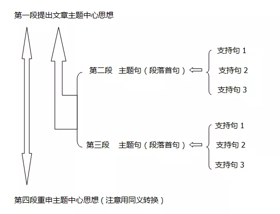 而第二、第三段中,若干支持句(一般三句)又支持各自主題句(段落首句);