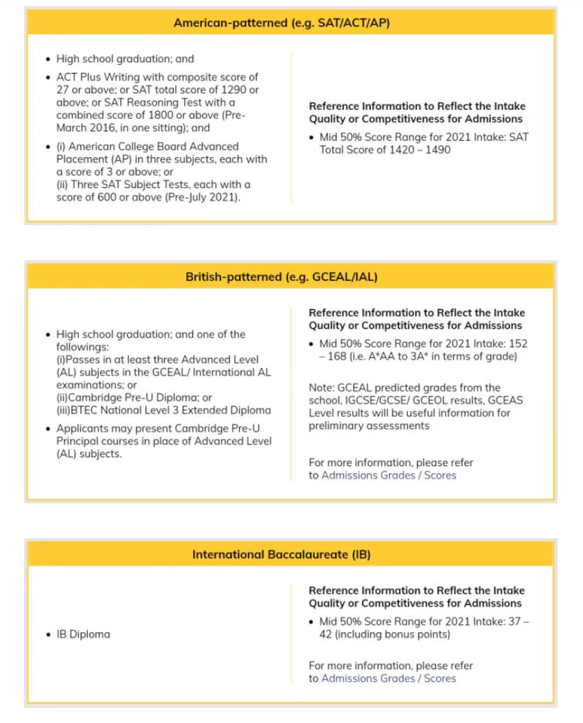 港中文官網標明的學科成績門檻非常低:IB總分在30分及以上;A-Level需要3門AL,成績不低于CCC;2門AP3分以上加上SAT 1190。