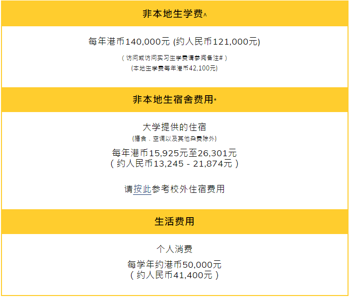 香港科技大學非本地學生需要繳付的本科學費是14萬港幣/年,住宿費用因人而異,大致在1.6-2.6萬港幣左右。