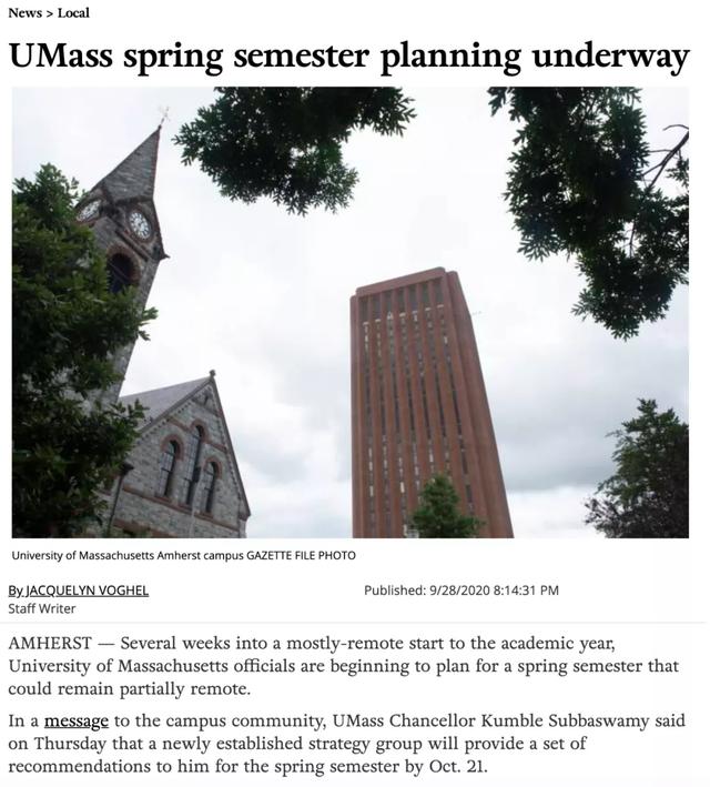 麻省大學(xué)近期也表示正在考慮春季在線上授課。UMass的校長(zhǎng)表示,根據(jù)他們掌握的消息,學(xué)校可能要為春季繼續(xù)在線上授課做好準(zhǔn)備。