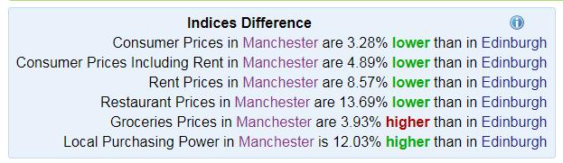 numbeo.com比較曼城和愛丁堡的消費水平,曼城整體更低