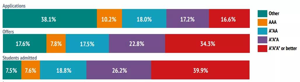 以英國地區學生的申請數據為例,2019錄取數據顯示,AAA是牛津的Z低A-level標準,很多課程-尤其是理科,至少要求有一個A*。半數申請者與85%獲得錄取的學生成績都達到A*AA或以上。錄取學生中40%的人成績達到A*A*A*。