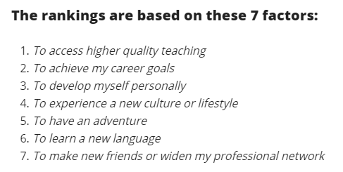 與QS等排名不同的是,這份排名并不十分關注學術,二十從學生體驗感的角度出發,總結出的參考排名,所以排名的標準也從專注學術變成了以下七點: