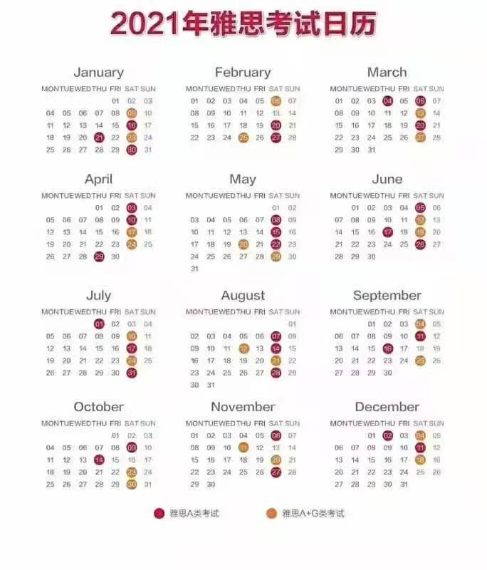 2021年雅思考試時間表
