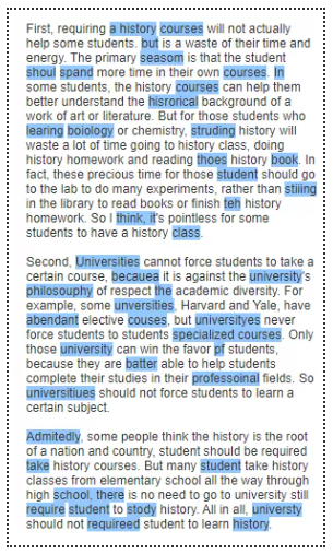 關于語法,尤其是國際學校的孩子們大多是憑語感來學習語言的,其實我們學習語文也是這樣的,所以先天對語法就不敏感,那么孩子如果語感又不強,寫出來的句子一定會讓人沒有讀下去的勇氣,而這個部分恰恰是系統評分占比較大的一部分(我們的寫作是機器和考官同時評分的),可以給大家看一個學生的范例: