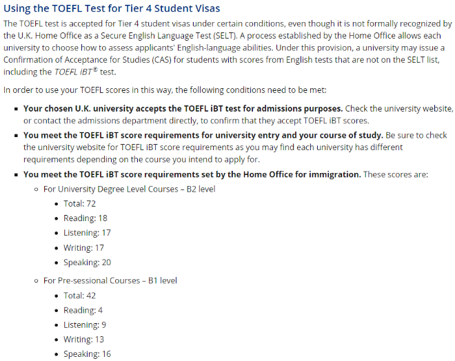 2020年4月20日,英國內(nèi)政部在the UK Home Office官網(wǎng)發(fā)布的「疫情期間Tier 4學(xué)生簽證申請(qǐng)指南」中規(guī)定,托福成績達(dá)到B1 level(托福42分以上)就可申請(qǐng)英國大學(xué)語言課與Tier 4學(xué)生簽證。