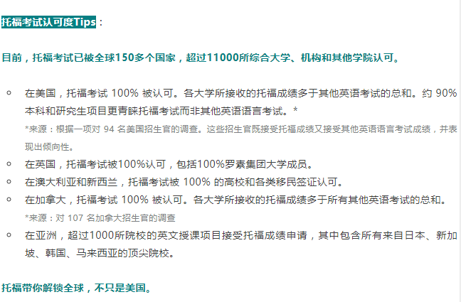 在留學(xué)多國聯(lián)申成為趨勢(shì)的當(dāng)下,ETS官方還發(fā)布消息,托福考試被全球150多個(gè)國家,超過11000所綜合性大學(xué)、機(jī)構(gòu)和其他學(xué)院認(rèn)可,范圍包括美國、英國、加拿大、澳大利亞、新西蘭以及整個(gè)歐洲和亞洲。
