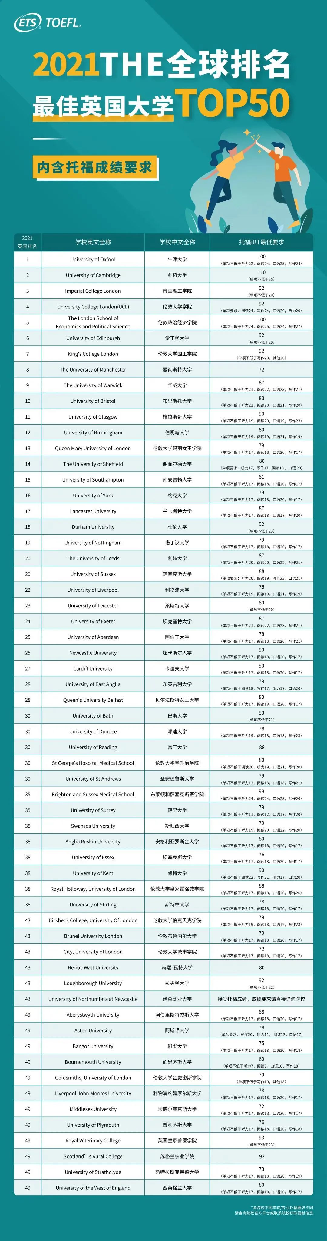 目前,英國大學(xué)TOP50托福要求如下: