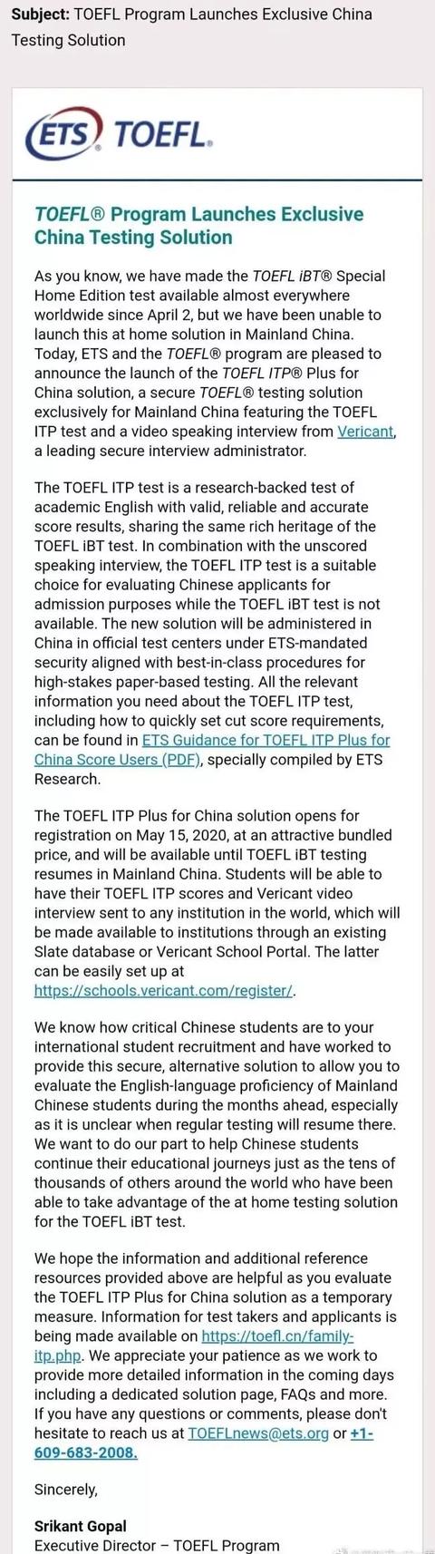 ①、考試“TOEFLITP Plus”將作為疫情期間正常的“TOEFLIBT”考試不能進行的時候,僅在中國大陸進行的考試,直至“TOEFLIBT”考試在中國大陸恢復;