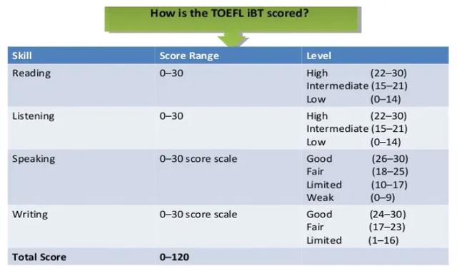 新托福考試由四部分組成,分別是閱讀(Reading)、聽力(Listening)、口試(Speaking)、寫作(Writing)。每部分滿分30分,整個試題滿分120分。整場考試在 1 天內完成,考試時長約 3小時。