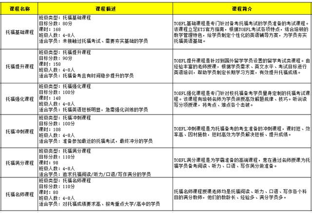 為了更好的提升學(xué)員的托福英語(yǔ)基礎(chǔ)與成績(jī),我們將托福學(xué)習(xí)分解為六大課程,分別是托?;A(chǔ)課程、托福提升課程、托福強(qiáng)化課程、托福沖刺課程、托福滿分課程與托福名師課程。
