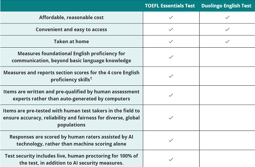 據(jù)高等教育內(nèi)參(Inside Higher Ed),ETS此舉是為用全新的托福考試對(duì)抗Duolingo的競(jìng)爭(zhēng),ETS官網(wǎng)中有一張TOEFL Essentials考試與Duolingo英語考試的對(duì)比。